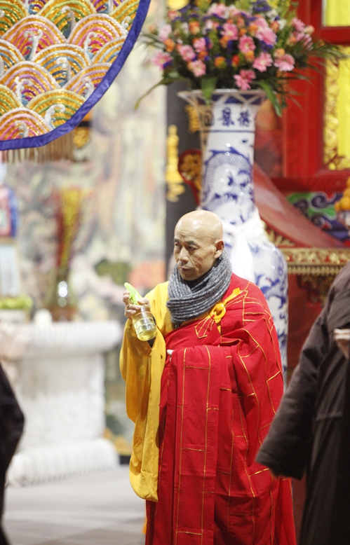 丙申年二月十六,傍晚六时三十分,慧日禅寺大雄宝殿举行洒净净坛仪式,以恭迎观世音菩萨圣诞,以及为期两天的《大乘妙法莲华经》诵经法会。果义法师拈香主法本次的甘露净坛。