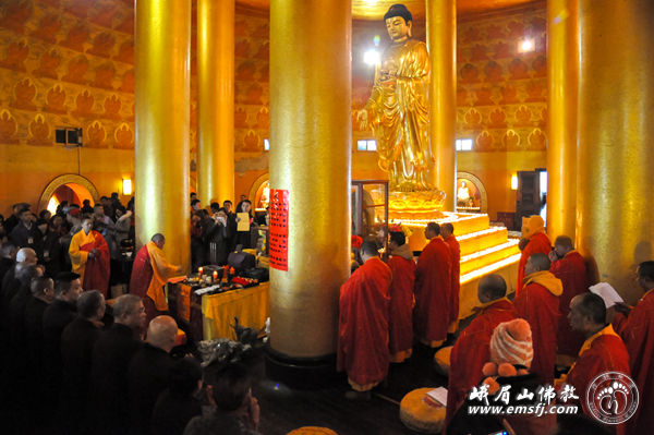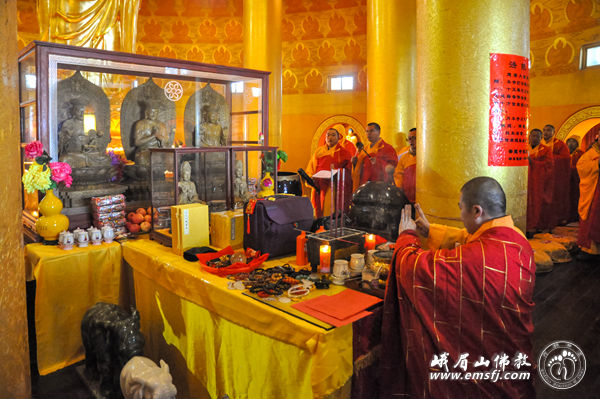 2016年3月29日,恭逢普贤菩萨圣诞之日,早上9点50分,峨眉山金顶华藏寺阖寺僧众在十方普贤像内阿弥陀佛殿中,为新安置供奉的三尊沉香木华严三圣像举行开光法会,法会由金顶华藏寺监院师镇觉法师拈香主法,法会如法如律、庄严圆满,近百位信众、游客共赴法会、同沾法喜。