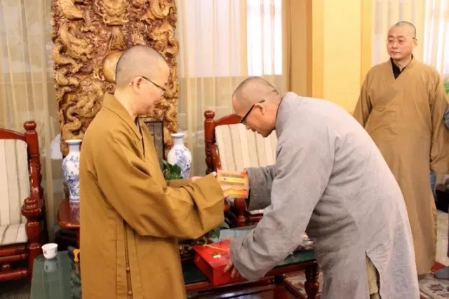座谈最后,监院利生法师、明清法师代表常住向客人赠送礼物。