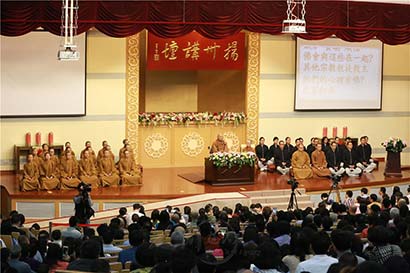 大师再度强调中华文化的特质在于禅,而禅有平等心,可以解决自己问题、人我关系和统一世界等困惑。“人不是心外的人,都是心上人”,大师幽默解释,因为世界并非与我们相对立。“佛陀在哪里?”大师说,佛陀在心里,但是我们心中充满贪瞋痴,佛陀怎会在心里呢?为此,大师又说:“佛在虚空,因为有大地让你种植、建筑高楼而安住;因为有水、日月星辰、空气而让生命存活,所以虚空是我们每一个人的。”
