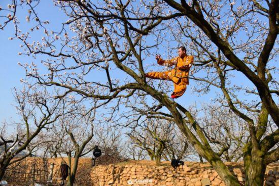终于亲睹江湖武林之美 武僧杏花树上习武
