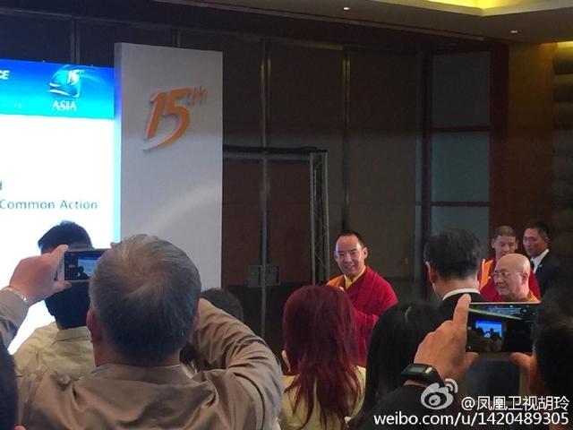 据媒体报道,作为藏传佛教格鲁派的宗教领袖,班禅额尔德尼确吉杰布身着一袭红袍,双手合十,始终笑容谦恭。从他步入会场那一刻起,镁光灯就闪烁不停。因为他的出现,可容纳200人的大厅座无虚席。