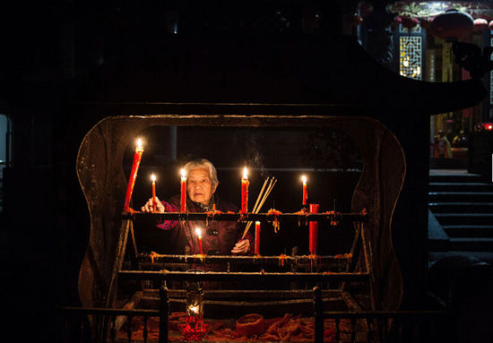 ▲一位老人在大殿前上香。(图片来源:美国在线)