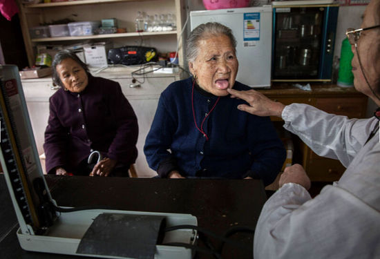 ▲70岁的李来凤(Li Laifeng)已经在这里义务当了20年的医生,她正在为一位老人进行检查。(图片来源:美国在线)