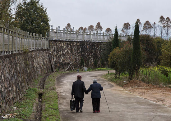 ▲87岁的邱发荣(Qiu Farong)和86岁的妻子魏钗迪(Wei Chaidi)在寺院做完祈祷、吃过午饭后走在小路上。