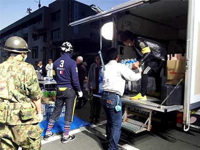 原本两个小时的车程,因道路寸断,必须寻找替代道路,经过6个小时的跋涉,直至晚间8点,物资终于安全送抵益城町役场。留守的自卫队及当地青年义工看到送进的物资非常开心,一同协助从货柜车上搬运下来。