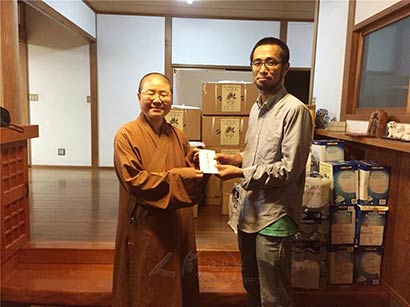 捐赠救灾慰问金予熊本八代功觉寺山口住持(图片来源:人间社 摄影:满净提供)