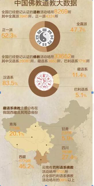 从已公布的全部信息来看,全国已经登记认证的道教活动场所8269所,其中全真派3945所,正一派4324所。全国已经登记认证的佛教活动场所33652所,其中汉语系28081所,藏语系3853所,巴利语系1716所。