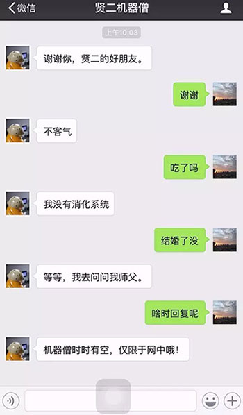 B.“佛家Siri”完胜阿尔法狗:嫁接上“李世石大战阿尔法狗”的大事件,“贤二”机器人的问世本身就是一个很大的新闻。“不出售”、“和尚团队两个月研发成功”,让大家以猎奇的眼光来看待这个“佛家Siri”。公众号“贤二机器僧”可以时时与网友互动,富有禅意、生动有趣的回答为它赢得了不少的粉丝。