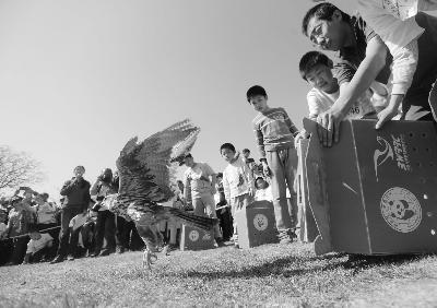 在爱鸟周活动中,志愿者们放飞了被救助的猛禽(图片来源:法制晚报 摄影:杨益)