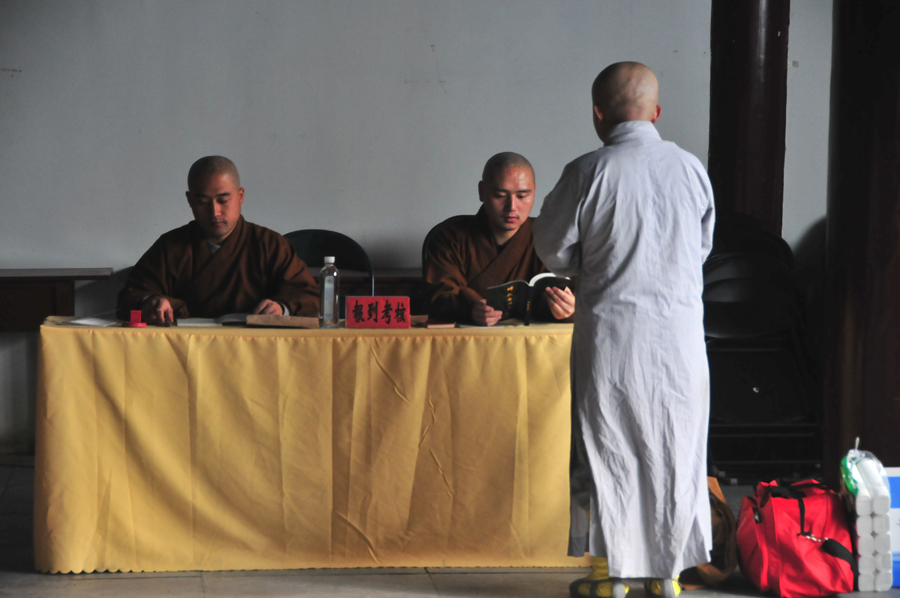4月7日清晨,在引礼师的带领下,戒子们排着整齐的队伍,在广福寺普贤殿接受严格的“面试”,每一位戒子需要进行五堂功课的考核,现场进行背诵唱念。不合格者将不予登记入单,严格按照佛制律法、祖定清规执行。考核通过的戒子方可前往法务处登记个人信息,接受行李检查,领新戒证及戒期所需的衣、钵、具等物品,方可入单。