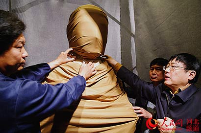 记者在《曲阳石雕》展厅看到,大佛全身被细致地用布包裹保护起来,安放在展厅的显要位置,佛首与佛身已粘接在一起。