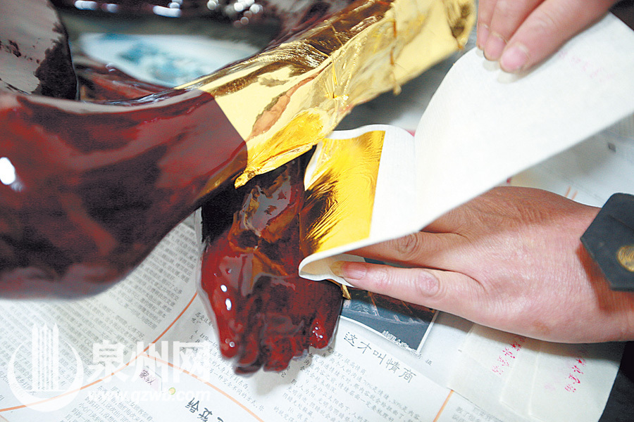 从事“肉身佛”制作三十余年的吴德玉介绍,塑金身即将已经出缸的僧侣法体经消毒清理后,涂漆,在漆风干之后,用瓦灰进行简短填补、塑形,而后再刷两层生漆至塑成的“肉身佛”表面,最后在最外层的“全身”贴上金箔,如此,“肉身佛”就塑成“金身”。高纯度金箔妆金。