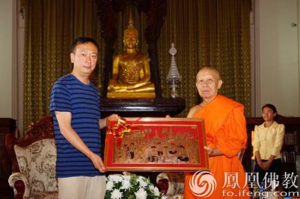 大理州委统战部副部長王灿明先生与老挝佛教友谊协会Maha Weth Masenay长老互赠纪念品(图片来源:凤凰佛教)