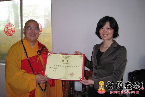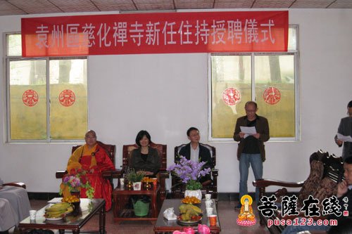 在受聘仪式上,袁州区政府党组成员万兰平颁发聘书给慈化禅寺新任住持圣愿法师。仪式结束后,全体人员在慈化禅寺山门前合影留念。市民宗局副局长周满德、袁州区委统战部副部长、区民宗局局长凌诚明、区民宗局副局长欧阳礼文在座。