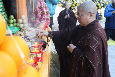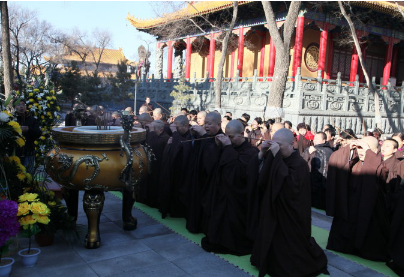 衍天法师,神情肃穆,缓步走到灵龛前,问讯,拈香,顶礼。此时现场大众近千人,依次持香来到他们敬仰的老法师灵龛前,将饱含着对老法师深深的恭敬和热爱,化作虔诚的顶礼,奉献给敬爱的老法师。