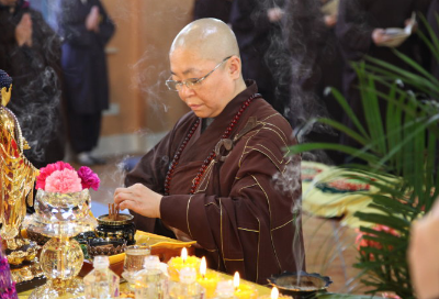 城市森林内的果成寺,梵钟悠悠,佛音袅袅。大众整齐肃立在敬爱的上果下成老法师的灵龛前,持香凝望,画像中的老法师依然微笑注视着大家,一如生前。
