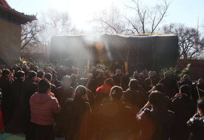 老法师的四位侍者,依旧忙前忙后,动作轻缓,就如同老法师生前的侍奉,在整理着灵龛前的一切。