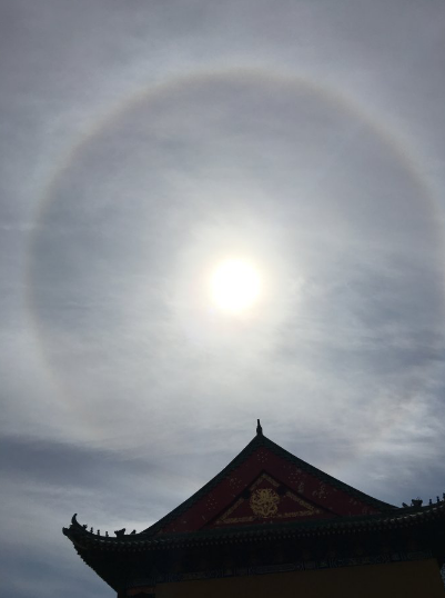 刹那间,太阳周围突然出现一圈耀眼的光芒,周围祥云环绕,美不胜收。大众高喊佛号,雀跃欢喜。佛光普照,恒吉恒祥!