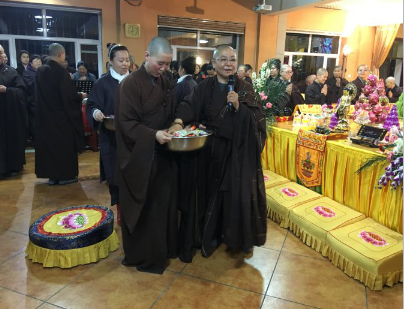 衍天法师亲自在灵龛前出食,威仪端然,庄严清净。
