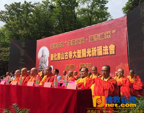 上午9点10分,熊山古寺圣地殿前坪举行此次开光法会庆典仪式。中国佛教协会副会长、湖南省佛教协会会长、湖南长沙麓山寺方丈圣辉法师,中国佛教协会副会长、北京广济寺住持演觉法师,澳门佛教中心协会理事长、澳门药王禅院住持戒晟法师和湖南省娄底市新化县县长邓光吕先生等嘉宾出席了此次庆典仪式。开光法会庆典仪式上,圣辉法师、演觉法师、戒晟法师、邓光吕先生先后致辞讲话。