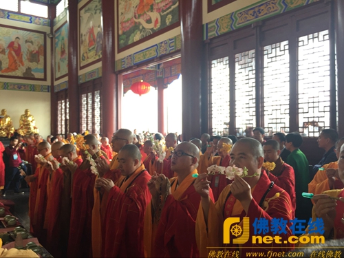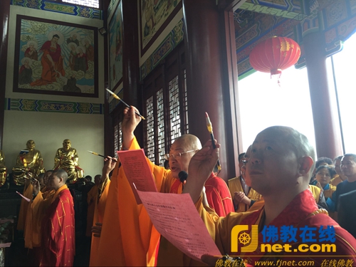 10点20分,熊山古寺圣地殿、大雄宝殿、观音殿三殿同时举行开光法会。大雄宝殿内,各位高僧大德主法,礼请净水遍洒法场。滴滴甘露洒落在庄严的佛像上,洒落在雄山古寺大雄宝殿内外,洒落在居士们及信众们的身上。依开光仪轨,主法高僧先后按照“朱笔点睛”等步骤进行开光。以此开光庆典殊胜功德祈福世界和平、国家昌盛、人民安乐、社会祥和、培植善根、增长福慧。