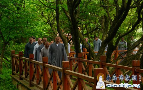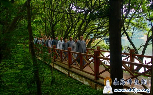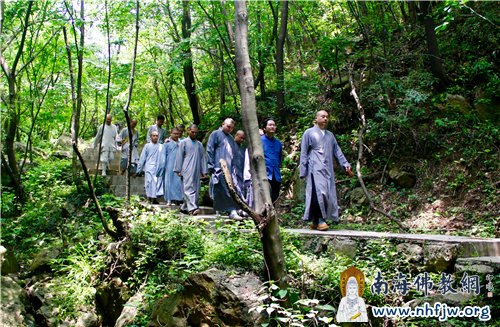 上午的坐禅告一段落后,大洪山慈恩寺监院明浩法师,带领众执事班学员一同在大洪山行脚,以历缘对境的行禅弥补动中的不足。学员们沿着郁郁葱葱的古道,仄仄平平的石阶,内护其心,外断诸尘,行走于祖师曾留下过足迹的地方。