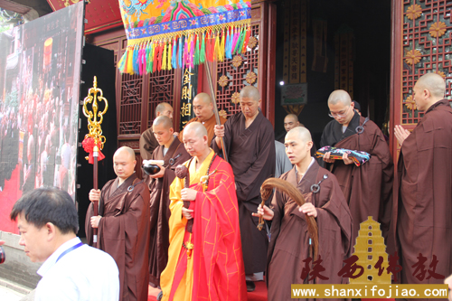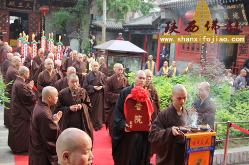 上午9时,仪仗旗幡开道,香磬引路,卧龙寺监院常印法师与寺院两序大众行至山门,恭迎常礼法师晋院,陕西省佛教协会副会长、大兴善寺方丈宽旭大和尚,江苏省佛教协会副会长、南京栖霞寺方丈隆相大和尚等大和尚分别为常礼法师搭衣、挂珠、授杖、授如意等。随后,常礼法师振锡说法,开正山门,于各殿堂上香、说法,沿途信众手持鲜花,纷纷鞠躬、合掌致敬。