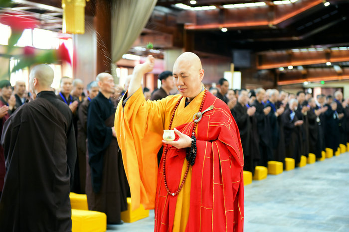只见青莲念佛堂内,全体求戒佛子身着海青缦衣,分东西两单恭敬排班,维那师起腔,大众齐唱《杨枝净水赞》。梵呗声起,东林寺方丈大安大和尚拈香礼佛。唱赞毕,三称“南无大悲观世音菩萨”,随后,大安大和尚手执净水杯盂,朗声诵《说水文》:“菩萨柳头甘露水,能令一滴遍十方。腥膻垢秽尽蠲除,令此坛场悉清净。”