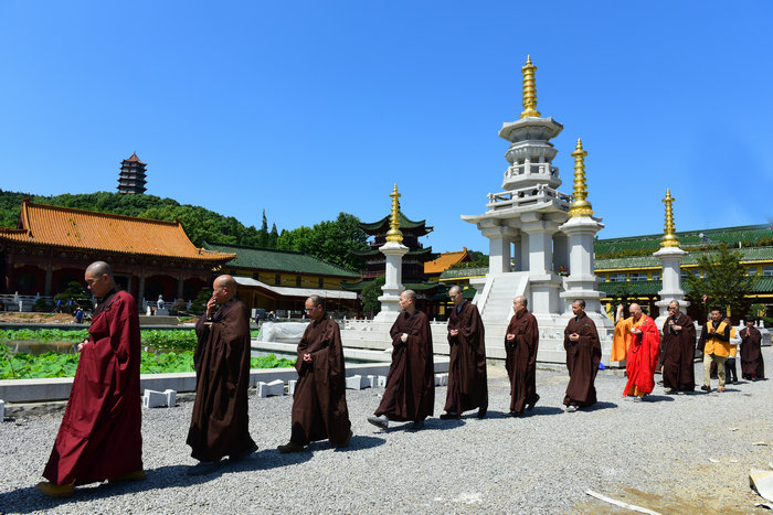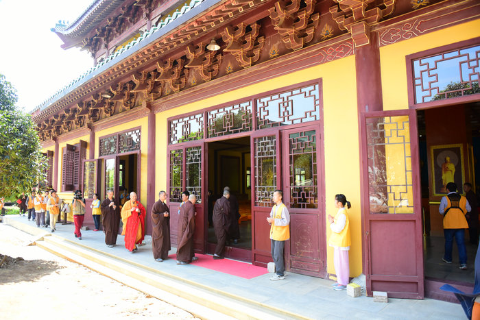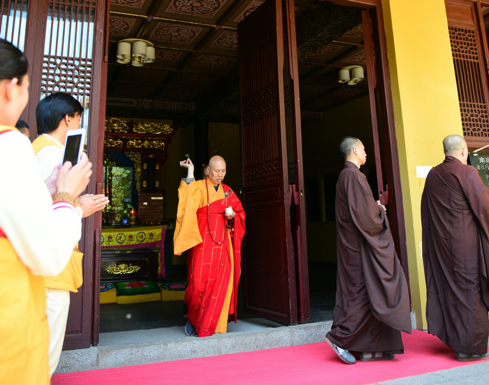 然后,于大众齐诵《大悲咒》声中,大安大和尚手持净水杯盂,与七位清净比丘僧,对寺院内主要殿堂进行了洒净。最后,洒净队伍一行回到青莲念佛堂,大安大和尚安详走过,洒甘露净水。所过之处,阵阵清凉,如降甘露,为诸佛子消障增慧。接着,大众在悦众师的引领下诵十小咒、《心经》,三称“摩诃般若波罗蜜多”,唱《佛功德赞》后进行了回向。