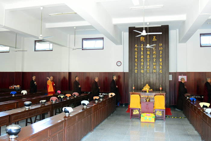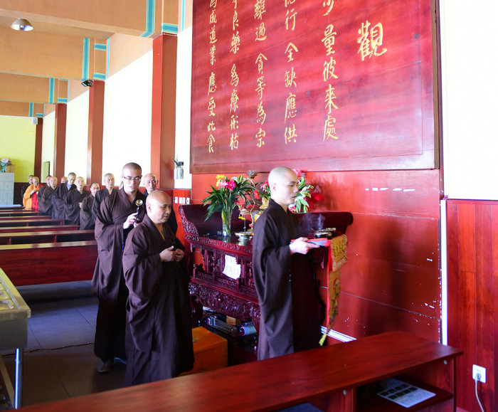 15点30分,由《赞佛偈》开始,诸佛子唱诵东林佛号,肃穆庄严的青莲念佛堂内,佛号响起,清畅哀亮,微妙和雅。一声佛号一声心,诸佛子至诚感通阿弥陀佛大悲愿力,声声唤醒本来人,本初善心菩提妙芽,由此显发。 18点30分至19点15分,戒子们在开堂和尚体空法师和悦众师带领下进行拜愿。诸戒子藉由礼拜称念诸佛菩萨名号,荡涤身心,忏罪集 资,祈求佛力加被,菩提心显,得无作戒体。