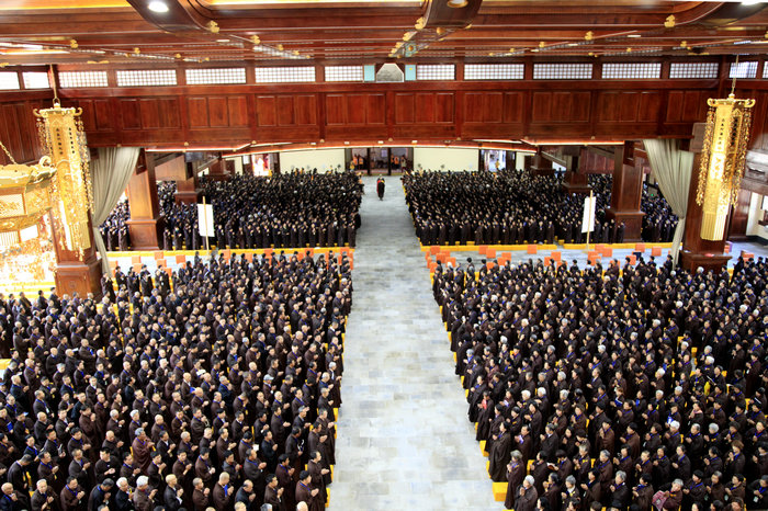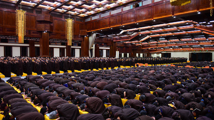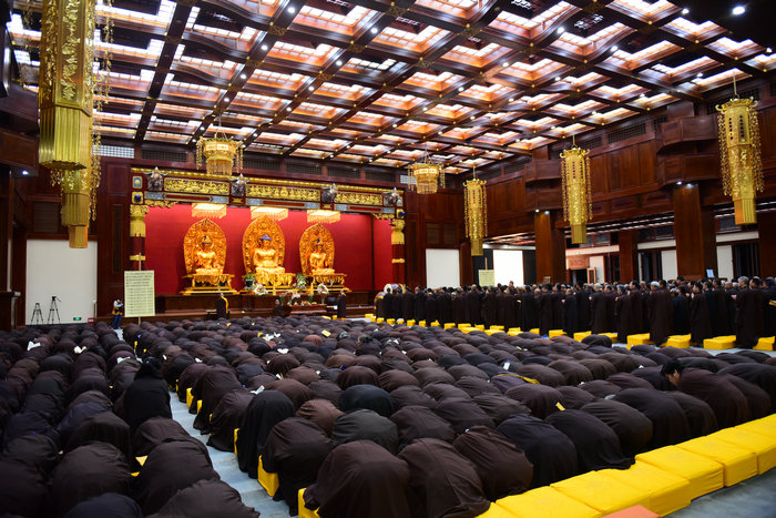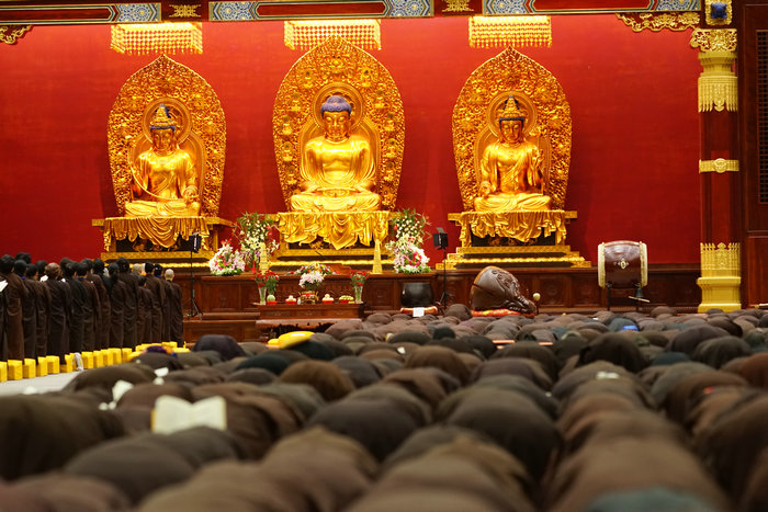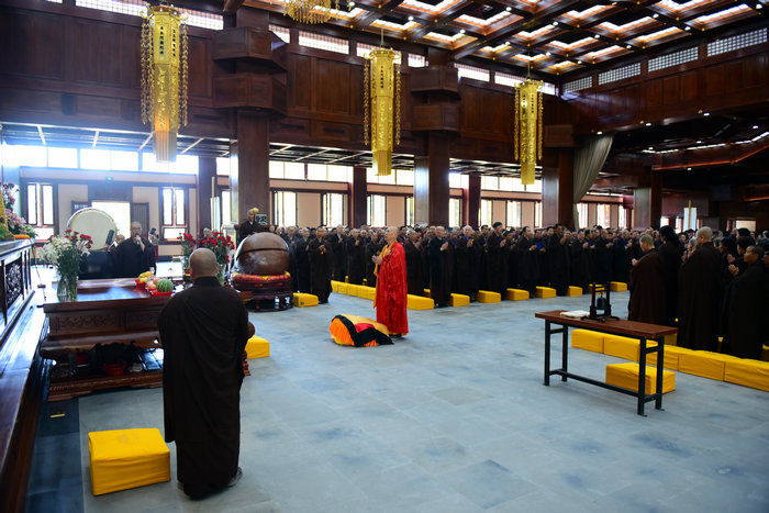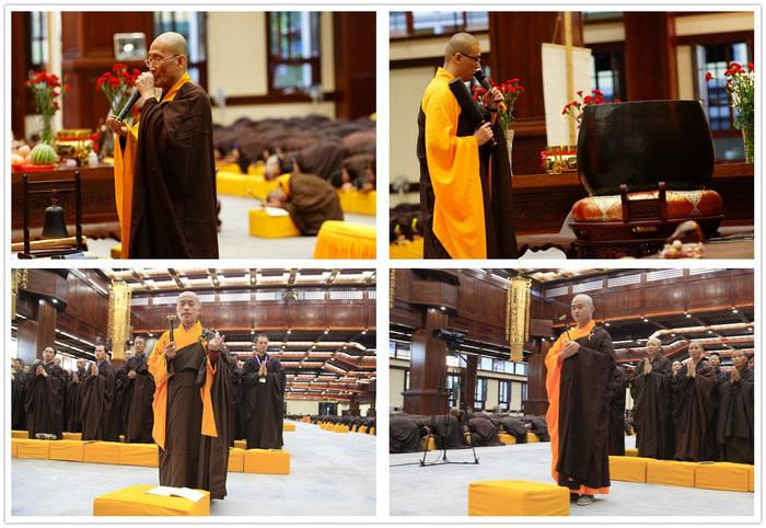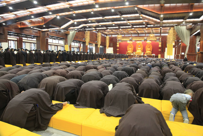 戒子们在开堂和尚体空法师和悦众师带领下进行拜愿