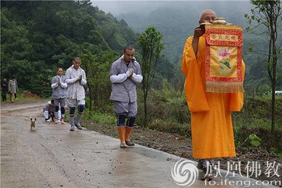 湖北咸安无相寺能戒法师、能弘法师、隆华居士、心传居士等一行,从咸安无相寺起香,三步一拜朝礼归元寺昌明老和尚舍利。(图片来源:凤凰佛教)