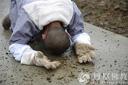 以虔诚之心三步一拜朝礼归元寺昌明老和尚舍利。(图片来源:凤凰佛教)