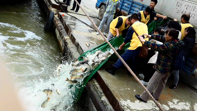 随后,大众兵分两路:一路来到鄱阳湖放生泥鳅、黄鳝;另一路去到长江边上,将一车鱼放归浩浩江水。11:00左右两路人顺利返回净土苑,此次放生圆满完成,共计10余万块钱的水族物命获得了解救,也希望他们能够籍此皈依之功德,尽此一报身,同生极乐国。