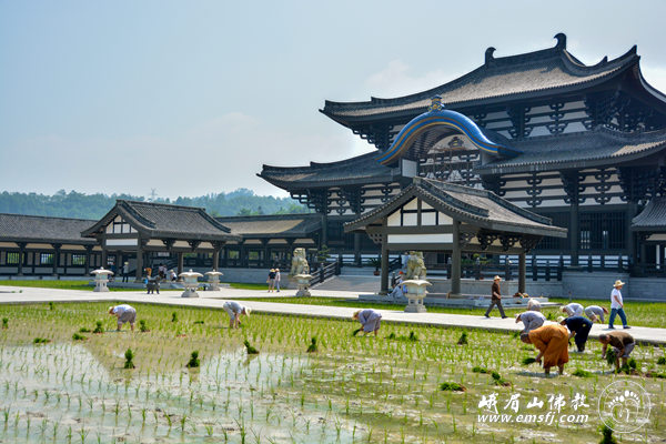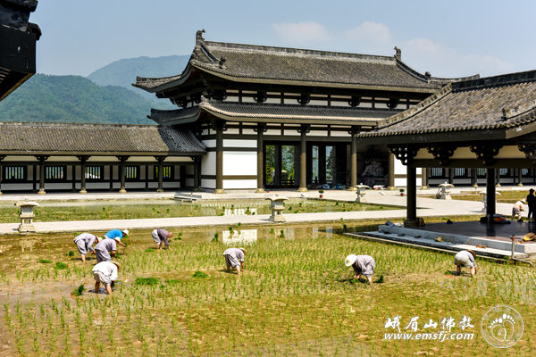 插秧结束后,永寿大和尚对大众开示说:“我们常说茶禅一味,但对农业与禅的关系,亦可说农禅一味。融禅于农、以农悟道也是一种生活习惯和修行方式。唐代禅宗的最大特点就是开荒种地和‘一日不作一日不食’,农禅文化也因此成为禅宗文化的重要组成部分,是中国佛教的优良传统,但‘农禅并举’制度目前已基本消失。峨眉山柳江光明寺的建立就是为恢复这一制度所作的努力,寺院建筑完全采用唐代佛教建筑风格,还在殿堂间布置了数十亩稻田、荷田,僧人在这里完全以唐代农禅方式生活、修行。我们还要把这里建成峨眉山佛教重要的修行中心,为大众提供一个具有纯粹唐代风格的殊胜、独特的修行环境,特别是他们在这里体验到的农禅合一的修行方式,更会使他们对当代中国佛教有一个新的感受和认识。”