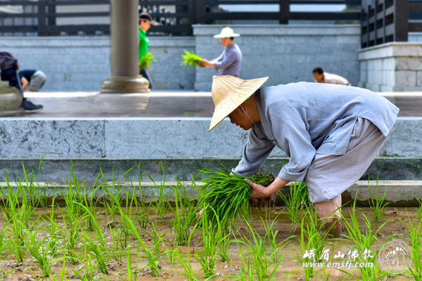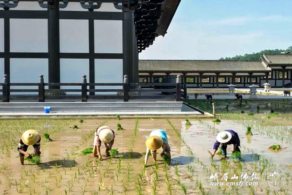 到达分布于寺院殿堂间的稻田边后,大和尚及众法师们卷起衣袖、高拈裤脚,下入田中,左手分秧,右手插秧,手起手落,动作娴熟。