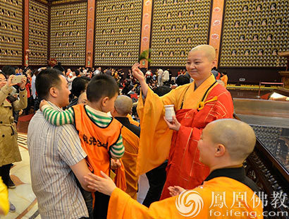 妙士法师为佛光宝宝甘露灌顶。(图片来源:凤凰佛教 摄影:周云)