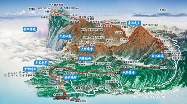 (线路A:大佛禅院、报国寺、伏虎寺、圣水禅院、清音阁、万年寺、洗象池、灵觉寺、接引殿、金顶)