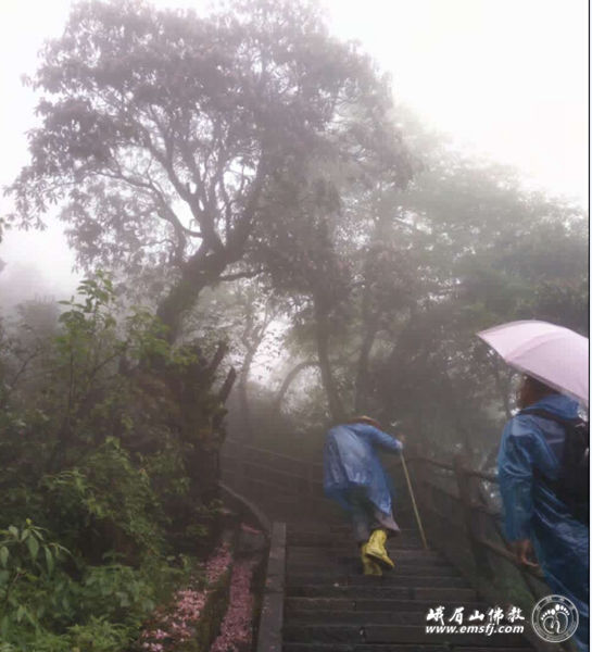 上午11时左右,行愿百人团继续冒着细雨前行,一路上,大家互相帮助、相互支持、不畏艰难、向着金顶进发。