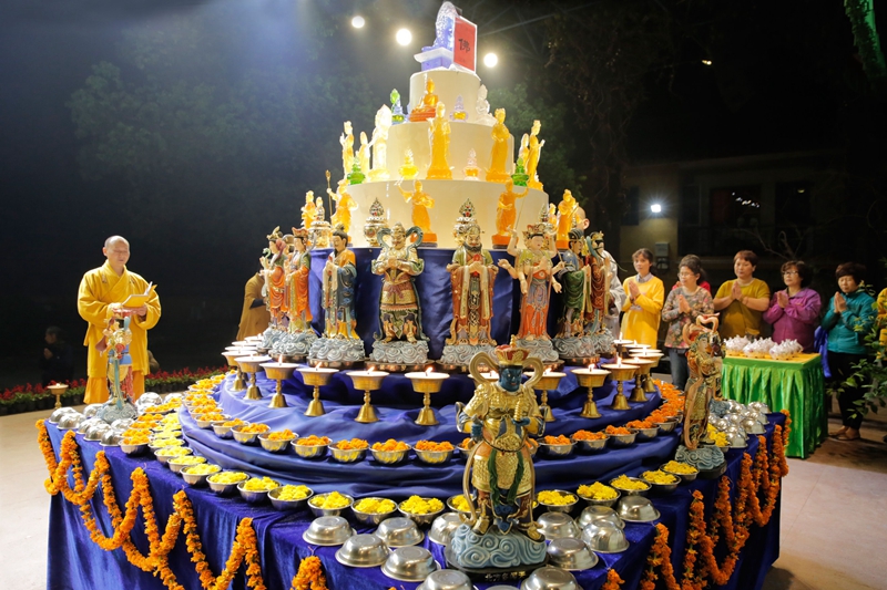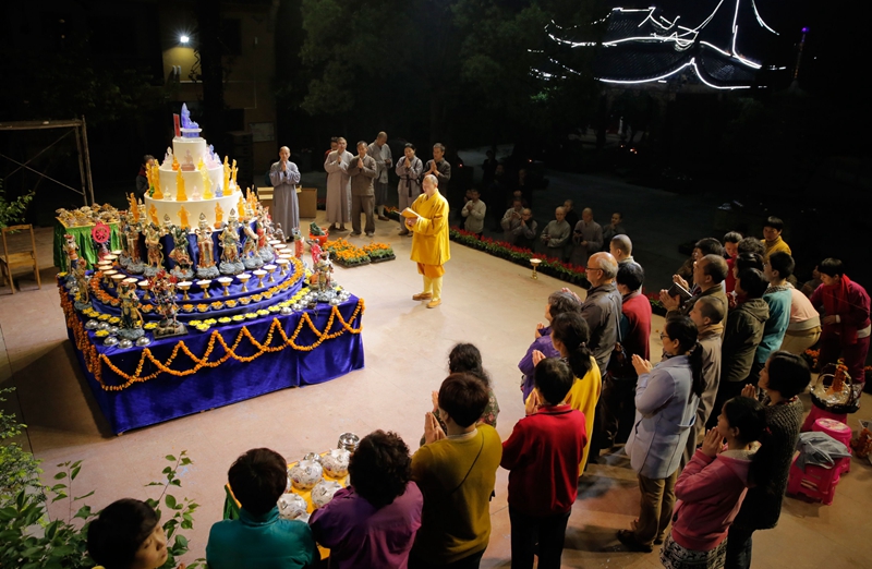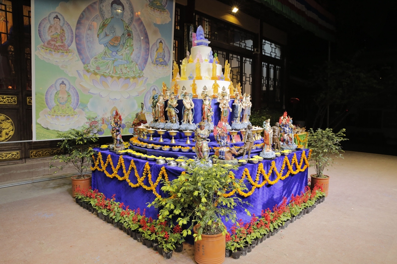 晚上,传喜法师于三圣殿前主持药师坛城仪轨,并作开示。