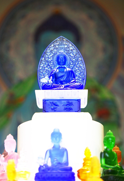 三圣殿前,慧日禅寺首次布坛药师七佛坛城。义工菩萨以虔诚心,精心布置了庄严的药师坛城,在蓝色琉璃光的映照下,药师坛城巍奂生光,殊胜庄严。住持传喜法师为坛城开光,祈愿天下太平,福增灾消,一切众生的内在觉性皆得昭苏焕朗。