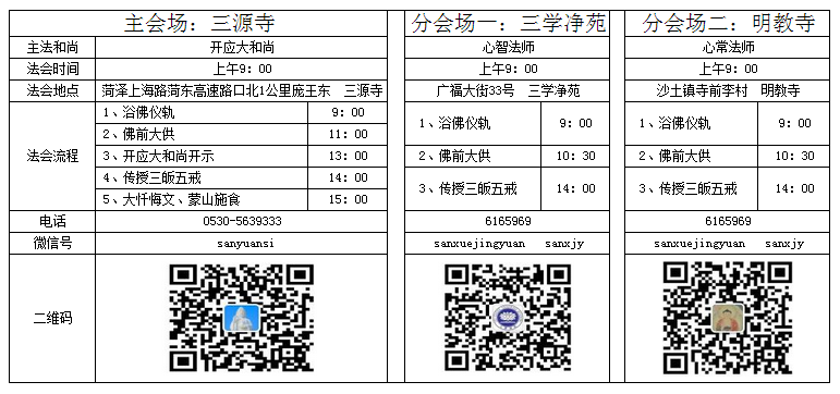 时值释迦牟尼佛圣诞,开应大和尚为祈请佛祖福泽天下、恩泽大地、消灾弭难、利益群灵,特于2016年5月14日(农历四月初八)隆重举办浴佛祈福法会。为更好的利益、方便大众,法会届时将设主会场(三源寺)、分会场(三学净苑、明教寺),大和尚将于主会场亲为大众开示、传授三皈五戒,以令大众净化心灵、消除尘垢,转五浊恶世为清净佛土,导迷惑烦恼为庄严菩提!