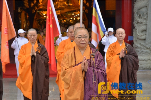 衍天法师依次将国旗、三宝旗及果成寺寺旗郑重地授给三位徒弟常德师、常茗师、常光师,此三面旗帜由果成寺大雄宝殿,途经世纪大道传至大庆三永湖栈桥中国结处,最后再按原路返回果成寺,中途设18个接力站点,全程共12.5公里。国旗与三宝旗传递的不仅仅是“出家不忘爱国、修行不忘济世”的人间佛教精神,更是果成长老悲心无尽、不舍众生的一生行愿,并让更多的人了知佛法的智慧,令大众得到佛法的利益。