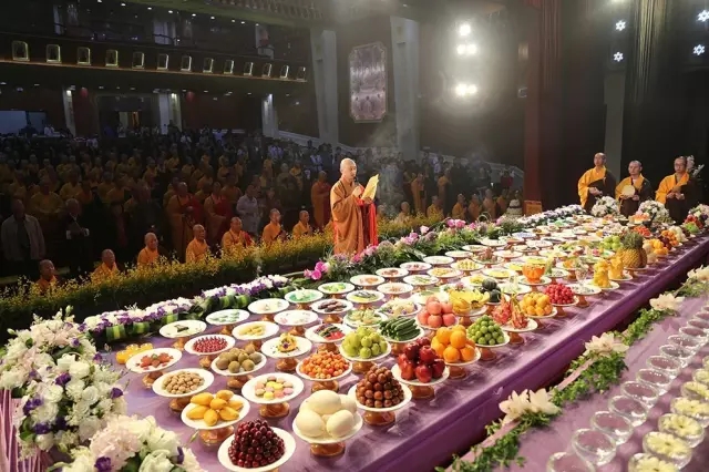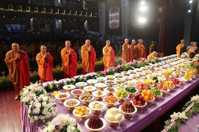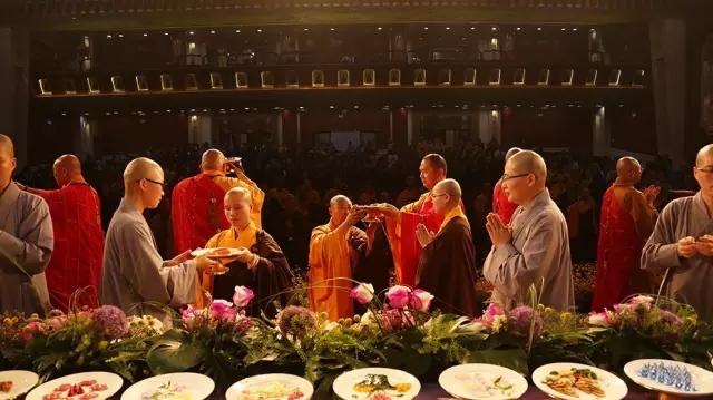 在“南无本师释迦牟尼佛”的庄严佛号声中,108道香花果品、百味饮食,由鸡鸣寺常住、江苏尼众佛学院学僧,以至诚恭敬之心,依次传递,场面隆重,神圣庄严。