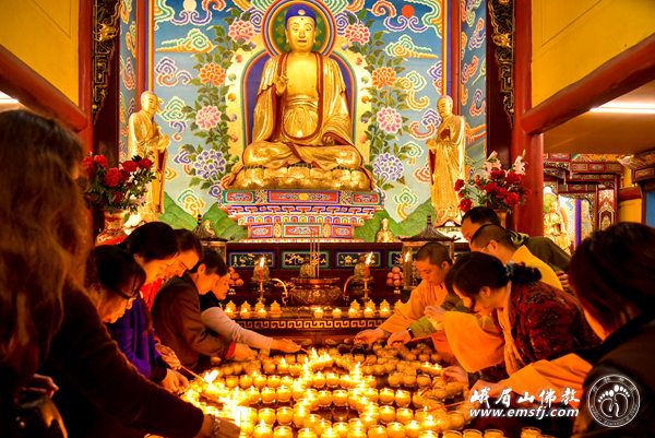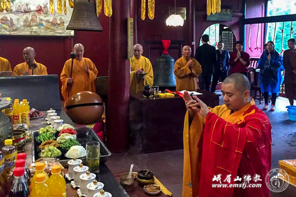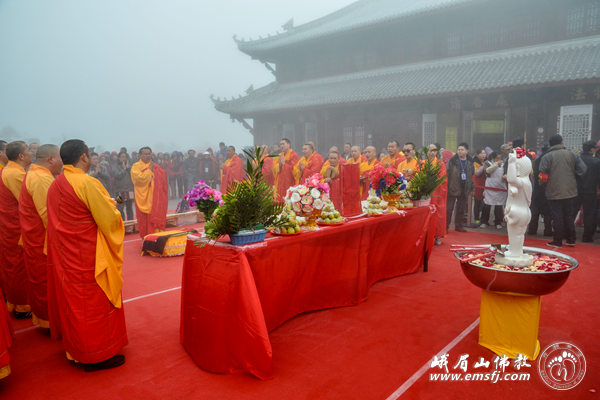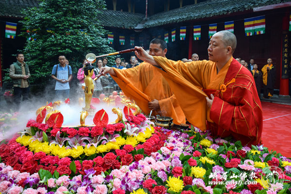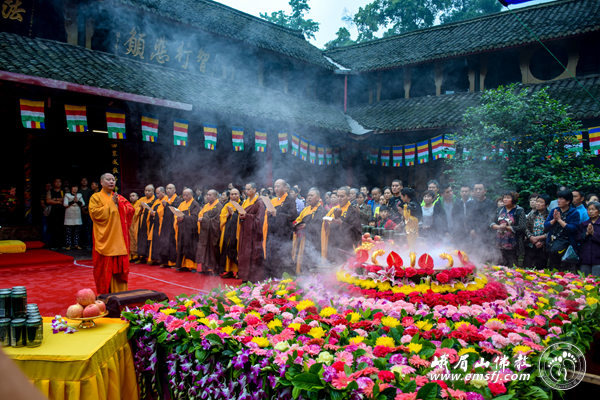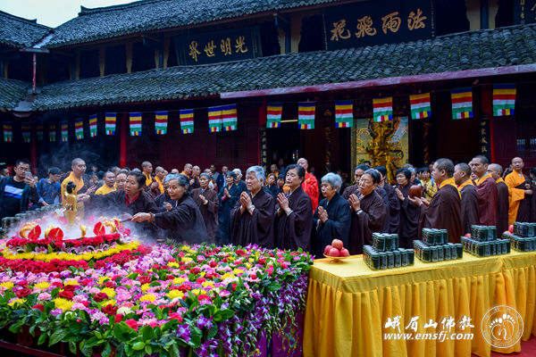 2016年5月14日,农历四月初八,恭逢三界导师、四生慈父释迦牟尼佛圣诞,峨眉山全山各寺院举行浴佛、拜忏、普佛、诵经、上供、供灯等多种盛大法会庆祝这一佛教传统节日,全山僧众、十方善信居士共赴法会,同浴佛恩。