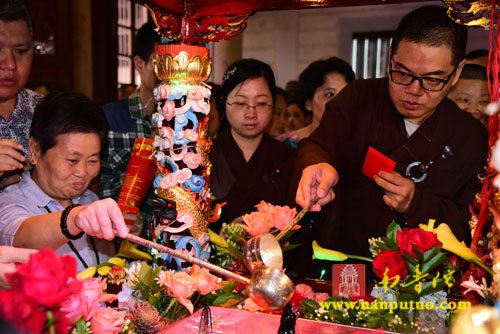 上午8时整,南普陀寺内钟鼓齐鸣,梵音悦耳,方丈则悟大和尚率两序大众至诚恭迎太子圣像。是时,仪仗队先行,童子散花供佛,两侧护法善信跪迎太子,在香客、游人的注目下,迎请队伍缓缓行至大雄宝殿,则悟大和尚将圣像安奉于浴佛亭内的香汤盆中。随后,维那妙真法师举腔,大和尚拈香主法,四众弟子诵经唱赞毕,大和尚代众宣祈愿文,并率先舀起香汤净水,灌沐太子圣像。常住班首执事及全体僧众、闽南佛学院男众部师生次第于浴佛亭前虔心浴佛。法会现场在义工菩萨们的护持下,隆重庄严,井然有序,广大信众、过往游客随喜参加,祈福迎祥。