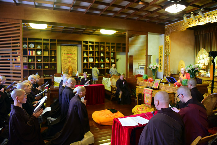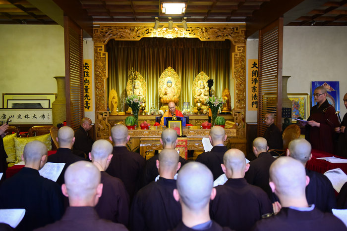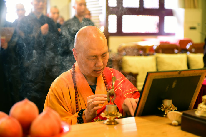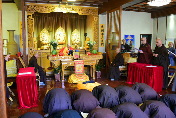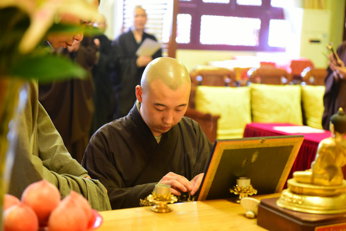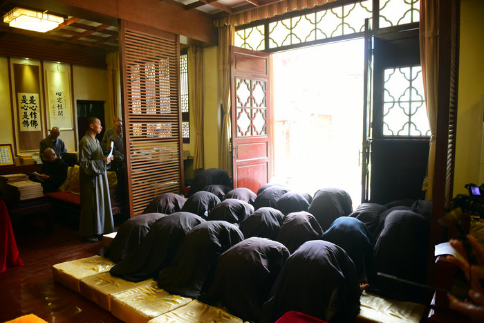 当日下午两点, 24位净人齐聚方丈室。东林寺首座本通法师和监院德亮法师于东西序就座。引礼兼维那师分别于东西两侧站立。本次剃度法会由东林寺方丈大安大和尚代法主和尚传印长老为诸位净人剃度。引礼师举《炉香赞》,大安大和尚拈香、礼佛后升座。随后,剃度者代表上香,24位剃度者礼佛。