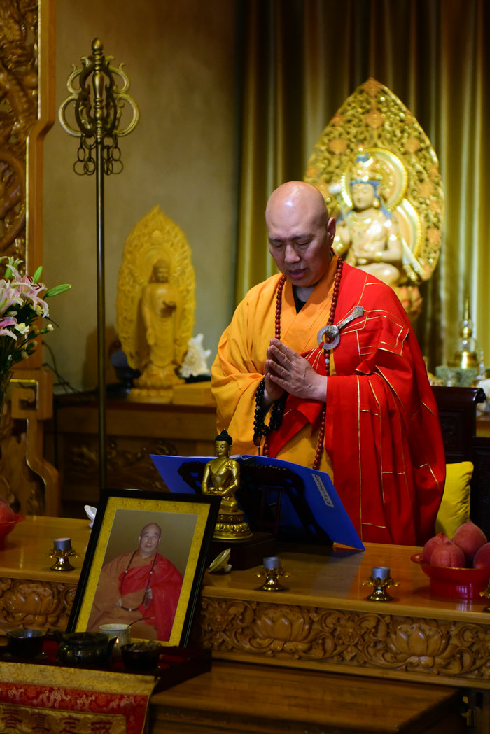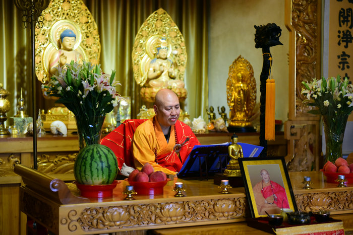 大安大和尚告云:可为汝等代上传下印法主和尚作剃度(桌子前面为传印和尚相片)
