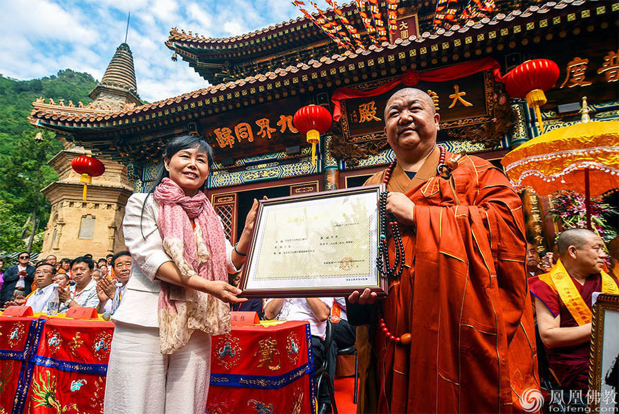 北京市门头沟区民族宗教事务局主任张翠萍为白瀑寺颁发宗教活动场所登记证。(图片来源:凤凰佛教)